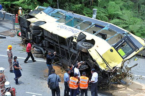 Pasukan bomba dari Balai Bomba dan Penyelamat Kuala Kubu Bharu dipanggil bagi mengeluarkan mayat mangsa dari kereta yang remuk teruk akibat kemalangan tersebut. GENTING HIGHLAND - 37 orang telah disahkan meninggal dunia dalam kemalangan jalan raya terburuk di Malaysia apabila sebuah bas terjunam ke dalam gaung yang mempunyai kedalaman sebanyak 100 kaki dari pusat peranginan Genting Highlands di Pahang petang tadi. Bas Terbabas di Genting Highlands.